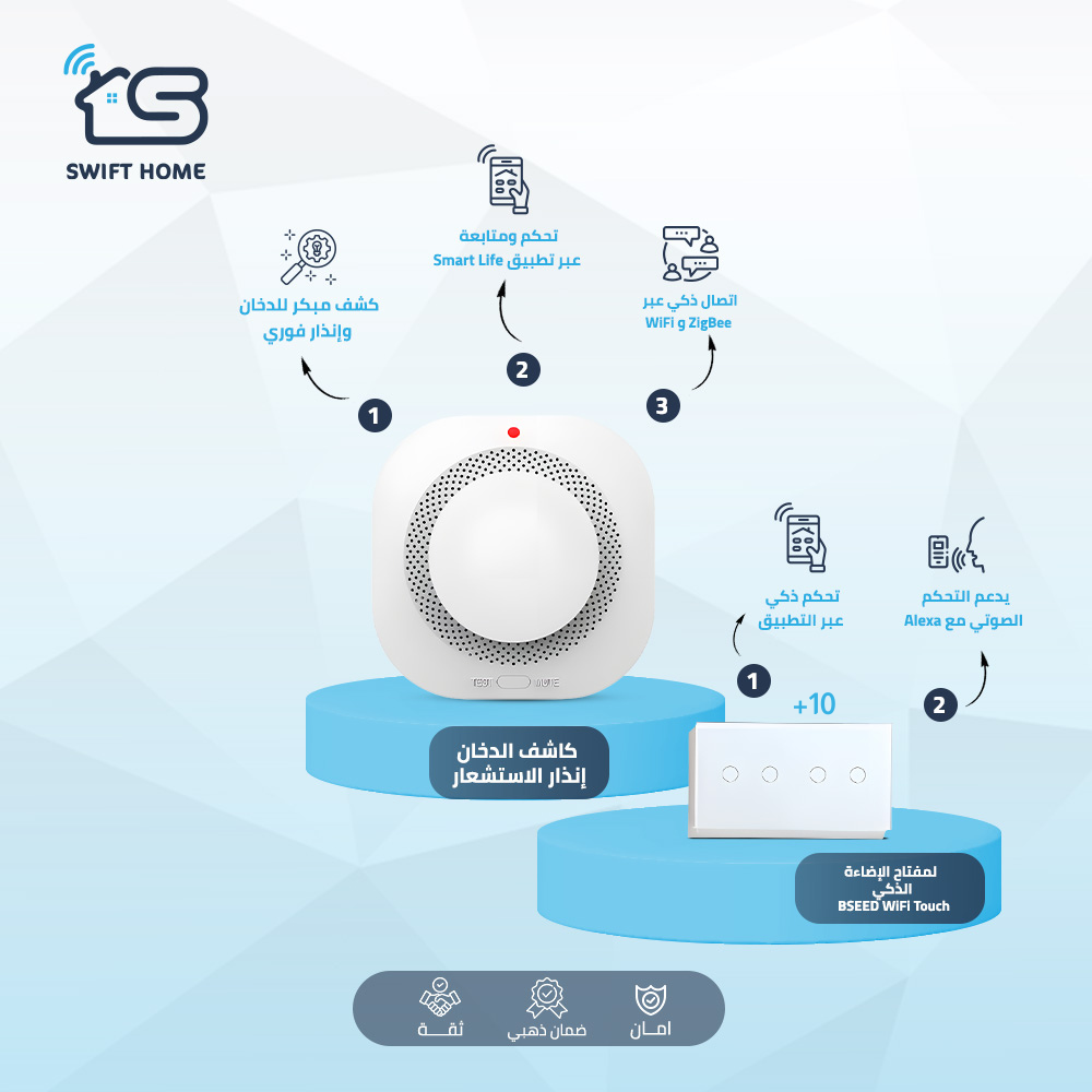 كاشف الدخان (إنذار الاستشعار): درع حمايتك من الحريق! يوفر كشفاً مبكراً بإنذار فوري، مع متابعة دقيقة عبر تطبيق Smart Life واتصال عبر WiFi و Zigbee.