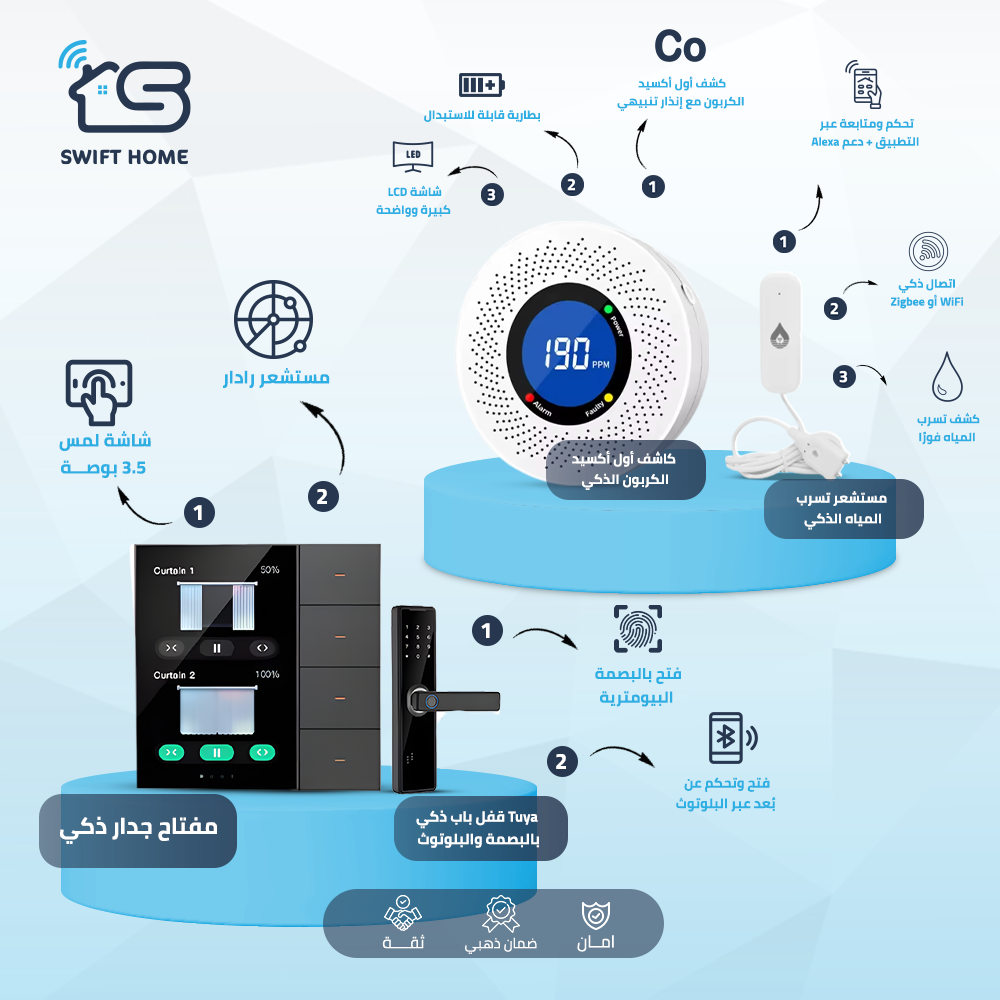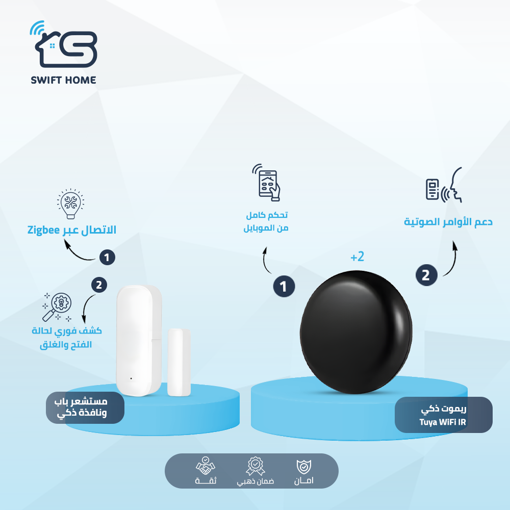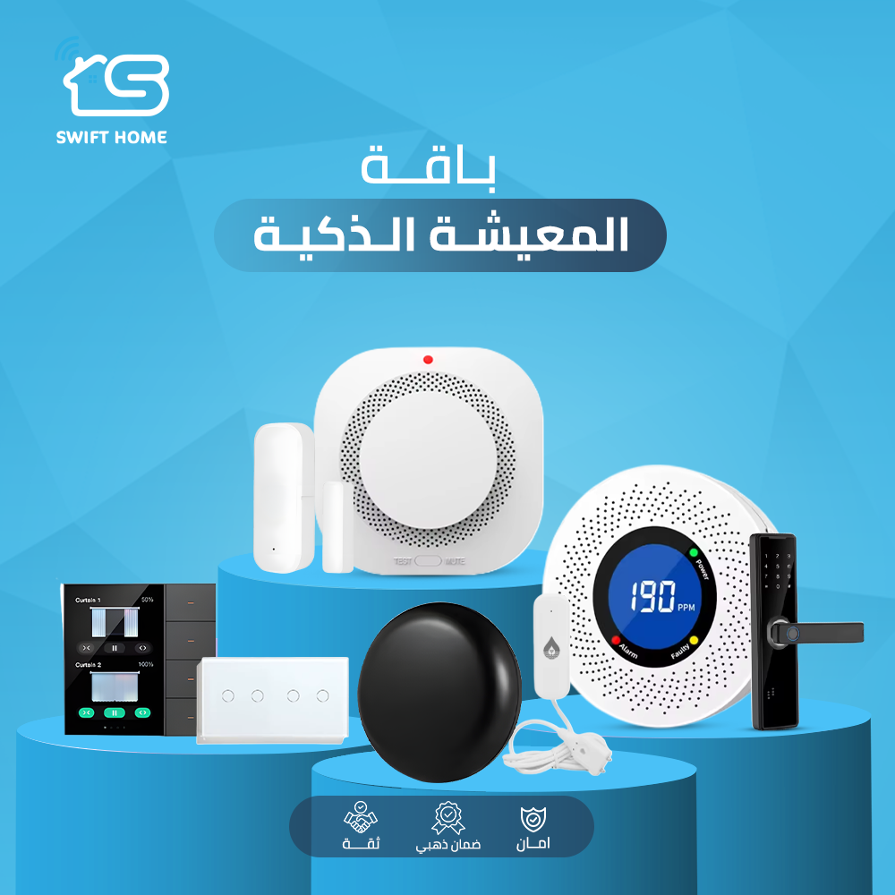 مع باقة "المعيشة الذكية" من (Swift Home) بيتك الآن يفكر، يشعر، ويستجيب لك! نحن لا نبيعك مجرد أجهزة إلكترونية، بل نمنحك "بروتوكول إدارة الحياة". نظام متكامل يربط 8 قطع ذكية لتعمل كفريق واحد؛ ليوفر لك أماناً مستداماً يحمي عائلتك وممتلكاتك حتى وأنت في قارة أخرى، مع توفير في فاتورة الكهرباء يصل إلى 40%.